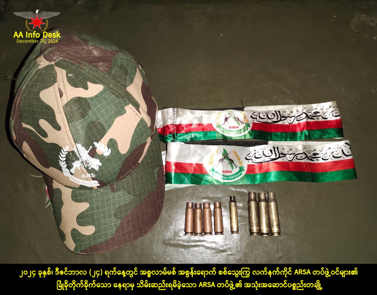 စခန်းသိမ်းရန် ရည်ရွယ်ချက်နဲ့ ချဉ်းကပ်လာတဲ့ မွတ်ဆလင်လက်နက်ကိုင်အဖွဲ့ (ARSA၊ RSO) တွေကို တိုက်ခိုက်ချေမှုန်းရာမှာ အလောင်းတချို့နှင့် စစ်အသုံးအဆောင်ပစ္စည်းတွေ၊ လက်နက်ခဲယမ်းတွေကိုလည်း သိမ်းဆည်းရမိတယ်လို့ ထုတ်ပြန်ချက်မှာ ဖော်ပြထားပြီး အရေအတွက်အတိအကျကိုတော့ ဖော်ပြထားခြင်းမရှိပါဘူး။