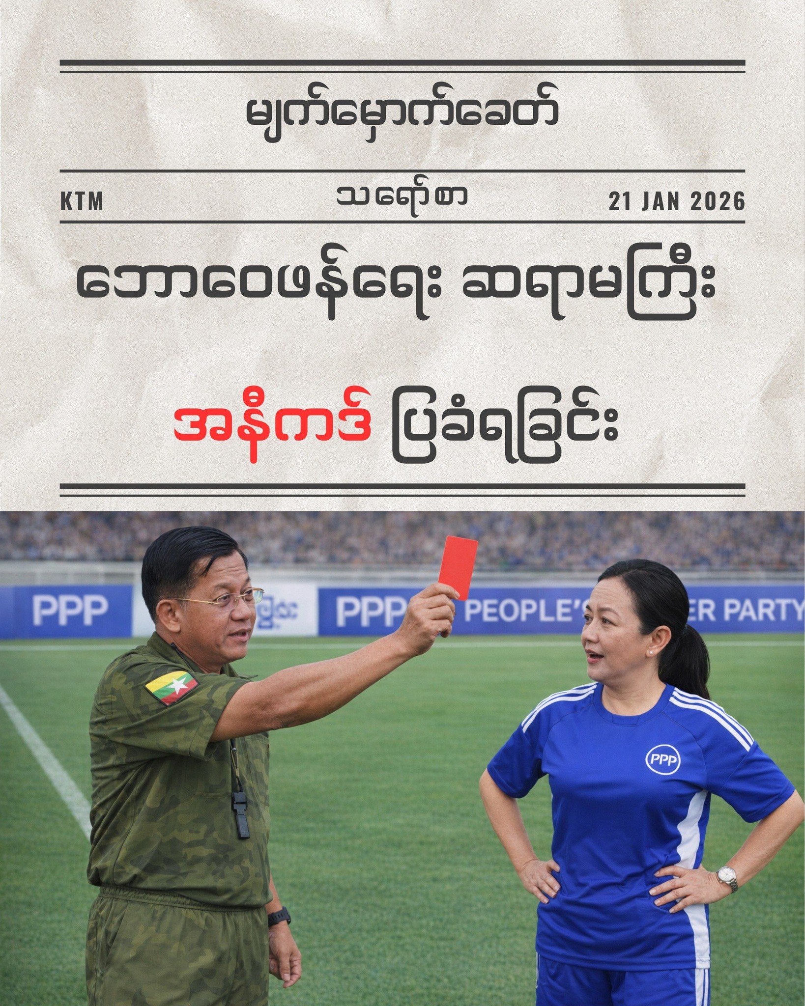 စစ်တပ်၏ အတုအယောင်ရွေးကောက်ပွဲမှာ ပါဝင်ခွင့်မရှိခဲ့သည့် ဒေါ်သက်သက်ခိုင်သည် စစ်တပ်ကို “ကိုယ်တိုင်ဒိုင်လူကြီးလုပ်ပြီး ကိုယ်တိုင်လည်း ဝင်ကန်သူအဖြစ်” ဘော်လုံးပွဲဥပမာနဲ့ ဝေဖန်ခဲ့သည်။ စစ်တပ်က သူ့ကိုဖမ်းဆီးသည်။ ဘောဆရာမကြီး အနီကဒ်ပြခံလိုက်ရသည်။