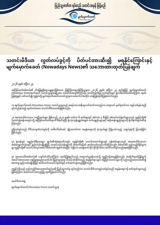 ၁။ မျက်မှောက်ခေတ် (Nowadays News) သတင်းဌာနသည် အရပ်သားအစိုးရလက်ထက်ကတည်းက တရားဝင် မှတ်ပုံတင်ကာ ကျင့်ဝတ်နှင့်အညီ ရပ်တည်ခဲ့သည့် လွတ်လပ်သော သတင်းမီဒီယာတစ်ခုဖြစ်သည်။