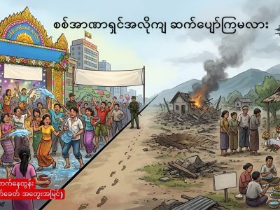 တက်နေထွန်း (မျက်မှောက်ခေတ် အတွေးအမြင်) အာဏာသိမ်းစစ်တပ်လက်အောက်က မြို့ရွာတွေမှာ လာမယ့် သင်္ကြန်ပွဲ တော်တော်စည်ကားဖွယ်ရှိပါတယ်။ အာဏာသိမ်းစစ်တပ်ကလည်း စည်ကားအောင် ကြိုးပမ်းမှာဖြစ်တယ်။ သူတို့ထိန်းချုပ်ထားတဲ့ နယ်မြေတွေမှာ ပြည်သူတွေပျော်ရွှင် နေကြတယ်ဆိုတာကို သူတို့က ပြချင်နေတာ ဖြစ်တယ်။ စစ်တပ်ရဲ့အလိုကျအတိုင်း ပျော်ရွှင်နေကြတဲ့ လူတွေလည်း မနည်းပါဘူး။... Read More